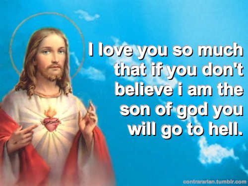 contra-jesus-love-hell”நான் பாவி, என்னை மீட்பதற்காக இயேசு சிலுவையில் மரித்தார். அவர் ஒருவரால் மட்டுமே என்னை மீட்க முடியும். இதை நம்பாவிட்டால் முடிவில்லாத நரகம் கிடைக்கும். இதை நம்பினால், பாவங்கள் நீக்கப்பட்டு முடிவில்லா சுவர்கத்தில் இன்புற்றிருக்கலாம்” என்று ஒவ்வொரு கிறிஸ்தவரும் நம்ப வேண்டும்.