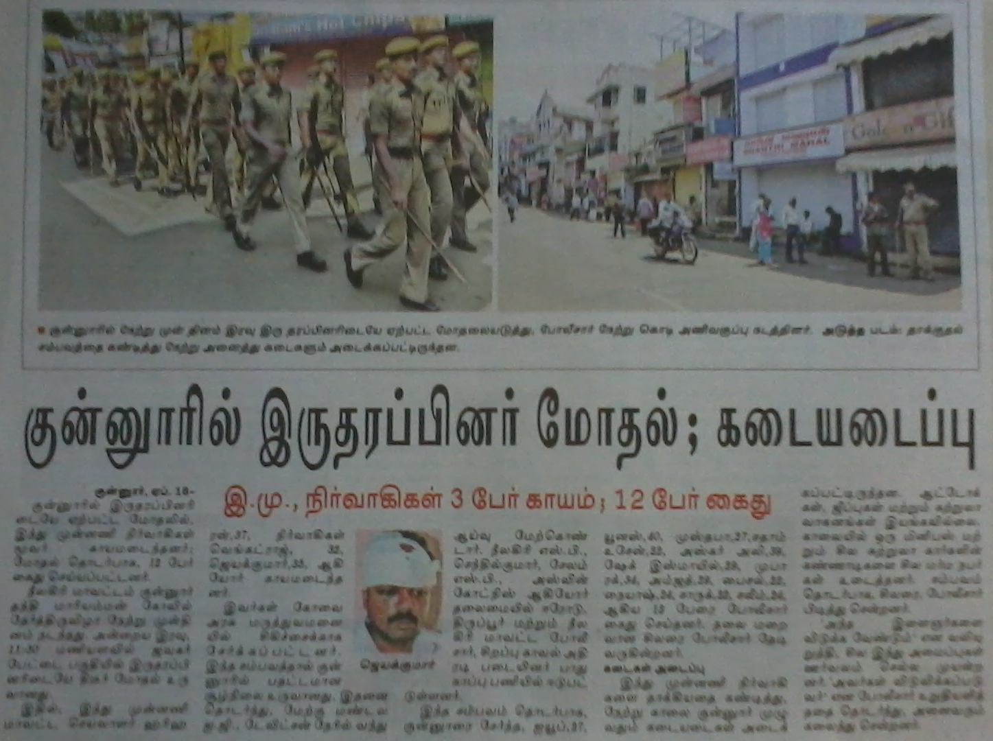 உதகையில் இந்து முன்னணி மாவட்டச் செயலாளர் தாக்கப்பட்டதைக் கண்டித்து குன்னூரில் 17-ம் தேதி ஆர்ப்பாட்டம் நடத்தப்பட இருந்தது. அது தொடர்பான சுவரொட்டியை இந்து முன்னணியினர் குன்னூர் பஸ் நிலையம் அருகே 16 -ம் தேதி இரவு ஒட்டிக் கொண்டிருந்தனர். அப்போது அங்கு 100-க்கு மேற்பட்ட முஸ்லிம்கள் திரண்டு வந்து தகராறில் ஈடுபட்டுள்ளனர். அங்கு வந்த காவல் துறையினர் தடியடி நடத்தி உள்ளனர்.