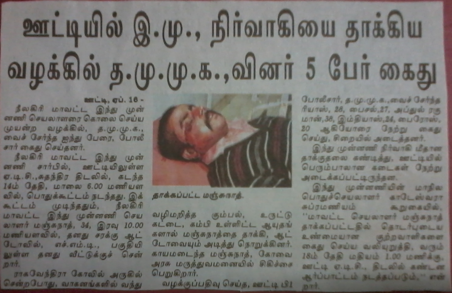 1. கடந்த ஆண்டு (06.11.2012) மேட்டுப்பாளையத்தில் திருப்பூர் மாவட்ட ஆர்.எஸ்.எஸ். செயலாளர் எஸ்.ஆனந்த் முஸ்லிம் குண்டர்களால் கொலைவெறித் தாக்குதலுக்கு ஆளானார். இந்த தாக்குதலில் ஆனந்தின் முகம் கடுமையாக சிதைக்கப்பட்டது. தெய்வாதீனமாக, தீவிர மருத்துவ சிகிச்சையால் அவர் உயிர் பிழைத்தார். எனினும் இன்னமும் அவர் இயல்பு நிலைக்குத் திரும்ப முடியவில்லை.இத்தாக்குதலுக்கு காரணமான கயவர்கள் மீது இன்னமும் சட்ட நடவடிக்கை எடுக்கப்படவில்லை.