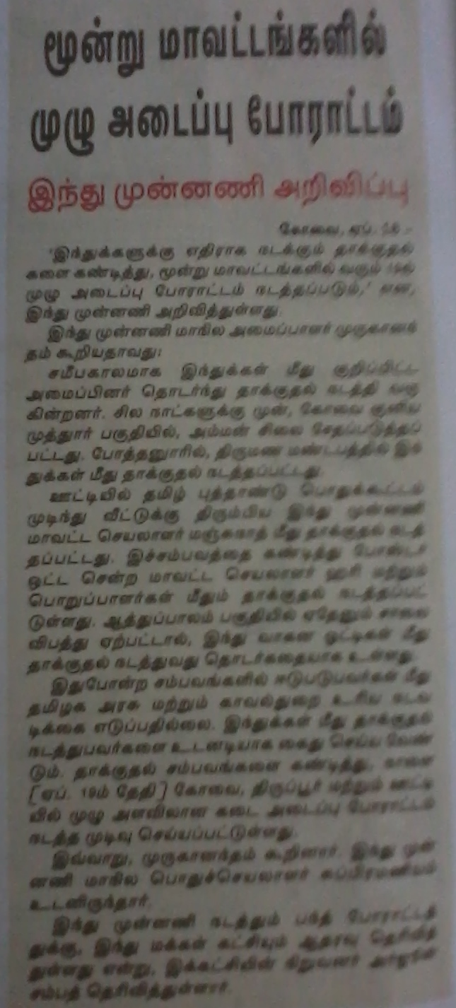 சமீபகாலமாக கோவை மண்டலத்தில் முஸ்லிம் அடிப்படைவாதிகளின் கரம் ஓங்கி உள்ளது. போத்தனூரில் திருமண மண்டபத்தில் நுழைத்து தாக்குதல், குனியமுத்தூரில் அம்மன் சிலை உடைப்பு, நீலகிரியில் இந்து முன்னணி நிர்வாகிகள் மீது கொலைவெறித் தாக்குதல், திருப்பூரில் விநாயகர் ஊர்வலம் மீது தாக்குதல் என்று முஸ்லிம் வெறியர்களின் கோட்டம் எல்லை மீறி வருகிறது. இதை ஆரம்பத்திலேயே கிள்ளி எறிய அரசு நடவடிக்கை எடுக்க வேண்டும்.